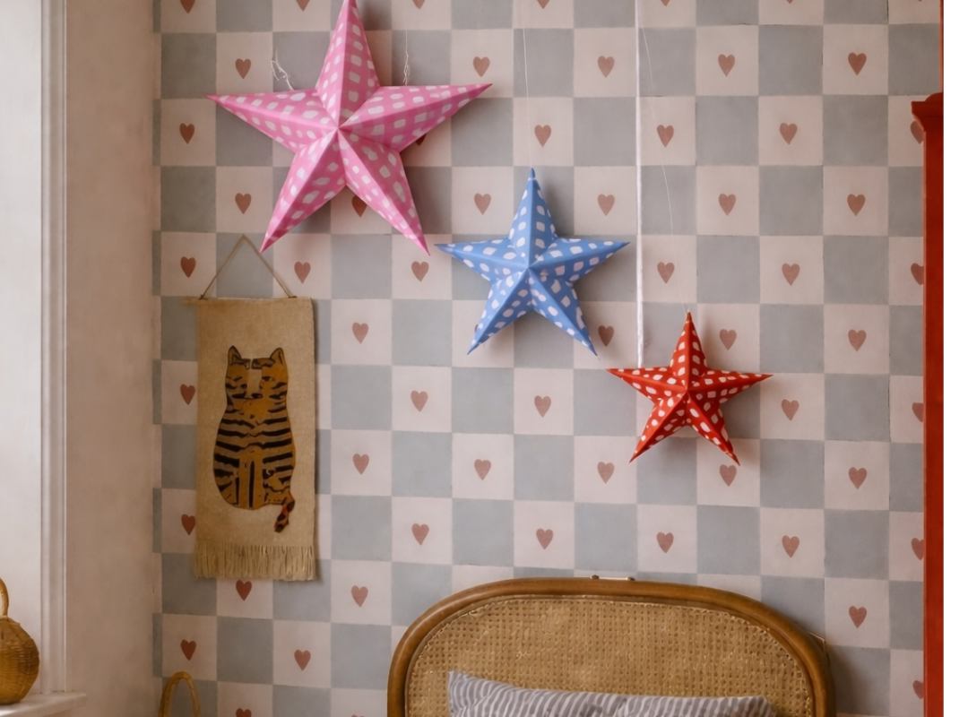 Bring a playful, storybook feel to your child's space with our Star Wall Decals. Lightweight, sculptural, stars designed to turn any wall into a moment. Crafted from responsibly sourced FSC certified paper, each star features a signature Cowrie & Conch gingham print in 3 colors.